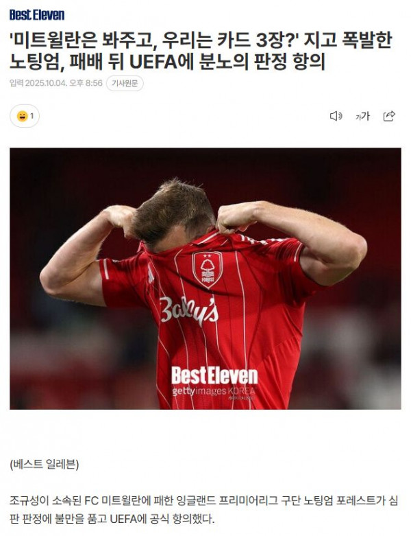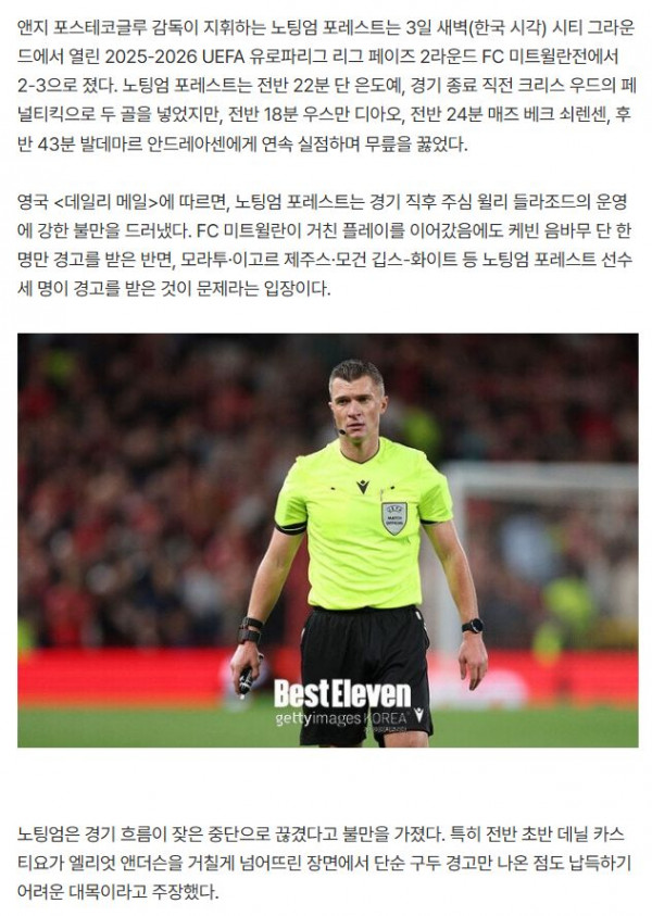 '미트윌란은 봐주고, 우리는 카드 3장?' 지고 폭발한 노팅엄, 패배 뒤 UEFA에 분노의 판정 항의