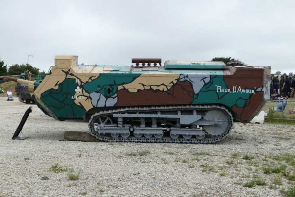 프랑스 탱크 '생샤몽'은 소뮈르 박물관에 있으며, 흥미로운 다색 위장무늬와 카드 문양으로 된 부대 표시가 있습니다.