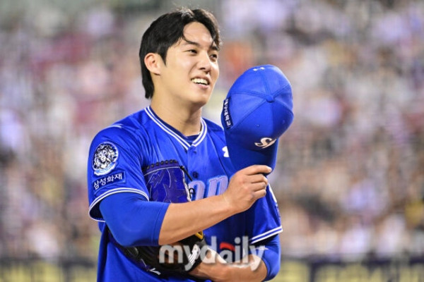 26일 서울 잠실야구장에서 열린 '2025 신한 SOL BANK KBO리그' 삼성 라이온즈와 두산 베어스 경기. 삼성 선발 원태인이 6회초 무실점 수비를 마치고 미소 짓고 있다./마이데일리
