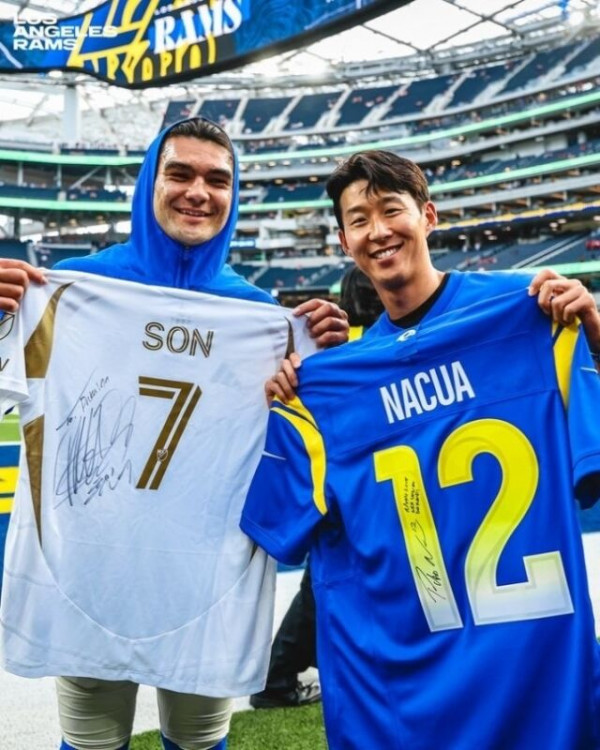 NFL의 LA 램스 구단은 3일(이하 한국시각) 샌프란시스코 포티나이너스와의 홈 경기를 앞두고 손흥민의 방문 소식을 전했다. 손흥민은 소파이 스타디움에서 램스의 푸카 나쿠야와 인사를 했고 유니폼 교환을 진행했다.