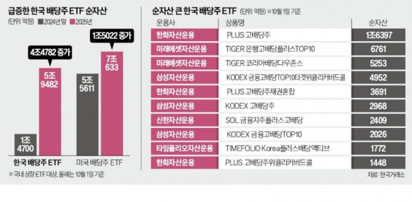의 대부분을 차지해온 미국 배당 상품 순자산은 같은 기간 5조5611억원에서 7조633억원으로 1조5022억원(27%) 증가하는 데 그쳤다. 지금과 같은 성장 추세를 감안하면 조만간 한국 배당주