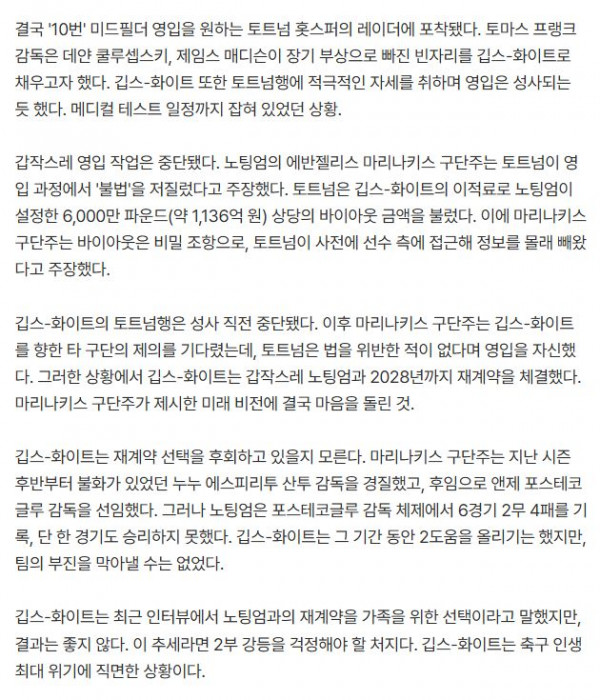 '토트넘행 포기→노팅엄 재계약' 인생 최대 실수였다…포스텍 감독과 함께 '끝없는 추락'