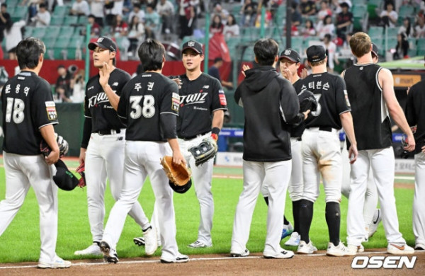 [OSEN=인천, 민경훈 기자] 25일 오후 인천 SSG랜더스필드에서 ‘2025 신한 SOL BANK KBO리그’ SSG 랜더스와 KT 위즈의 경기가 진행됐다. KT는 SSG에 10-1 완승을 거두며 4연승을 질주했다. 경기를 마치고 KT 선수들이 하이파이브를 하고 있다. 2025.09.25 / [email protected]