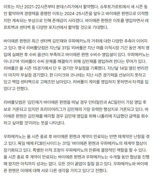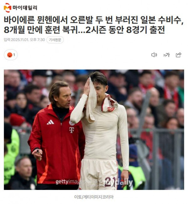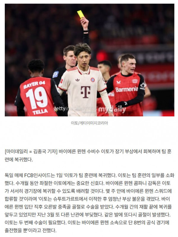 바이에른 뮌헨에서 오른발 두 번 부러진 일본 수비수, 8개월 만에 훈련 복귀…2시즌 동안 8경기 출전