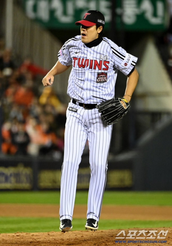 27일 서울 잠실구장에서 열린 한화와 LG의 한국시리즈 2차전. 4회초 2사 만루 김진성이 노시환을 헛스윙 삼진처리하며 점프하고 있다. 잠실=허상욱 기자[email protected]/2025.10.27/