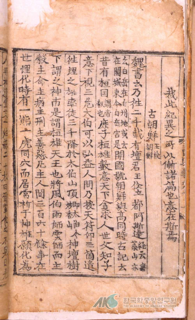 "'고기古記'에 말하기를, '옛날에 환인桓因 제석帝釋을 말한다 이 있었는데 여러 아들 중의 한 아들인 환웅桓雄이 천하에 자주 뜻을 두고 인간 세상을 탐하여 구하였다. 아버지가 아들의 뜻을 알고 삼위三危 태백太白을 내려다보니 인간을 널리 이롭게 할만 하였다. 이에 천부인天符印 세 개를 주며 가서 다스리게 하였다.'라고 하였다.(古記云 昔有桓因 謂帝釋也 庻子桓雄 數意天下 貪求人世 父知子意 下視三危太伯 可以弘益人間 乃授天符印三箇 遣徃理之)"