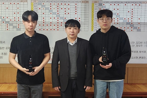 ▲ 준우승자 최윤상 아마(왼쪽부터), 충암바둑도장 조재영 사범, 우승자 김다빈 5단.