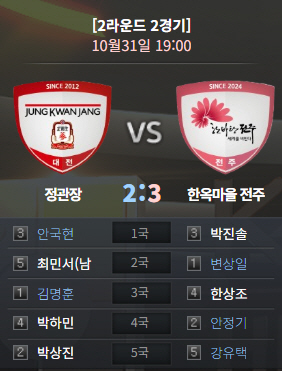1국을 승리하며 여유가 생긴 정관장은 루키 최민서(5지명)를, 여유가 없는 한옥마을 전주는 에이스 변상일을 출전시켰다. 바둑리그 데뷔 무대에 나선 최연소(18세) 바둑리거 최민서는 긴장한 탓인지 제 실력을 발휘하지 못하고 속절없이 밀린 끝에 패점을 안았다. 전주 1:1 정관장.