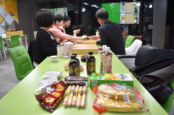 ▲ 저녁을 거른 선수들을 위해 다양한 간식이 준비되어 있는 한옥마을 전주 검토실. 경기 전 손수 세팅했다는 양건 감독의 세심한 손길이 느껴진다.