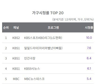 31일 시청률 조사기관 닐슨코리아에 따르면, 전날 KBS2에서 방송된 한국시리즈 LG-한화전 시청률은 전국 기준 10.0%로 1위에 올랐다.