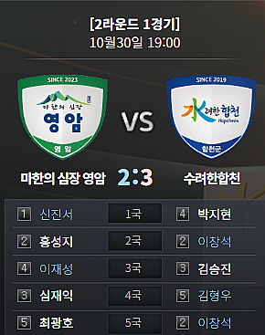 바둑리그 32연승이라는 전무후무한 기록을 보유한 신진서와 이날 데뷔전을 치르는 4지명 박지현은 중량감에서 차이가 날 수밖에 없는 대진이었다. 박지현은 초반부터 선실리 후타개 전략으로 분주하게 국면을 꾸렸지만, 신진서의 벽을 넘기에는 역부족이었다. 영암 1:0 합천.