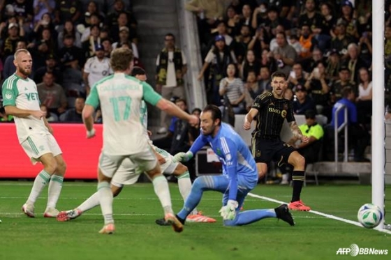 30일 오전 11시 30분(한국시간) 미국 캘리포니아주 로스앤젤레스의 BMO 스타디움에서 열린 2025 메이저리그사커(MLS)컵 플레이오프(PO) 1라운드 1차전 LAFC의 선제골 순간. /AFPBBNews=뉴스1