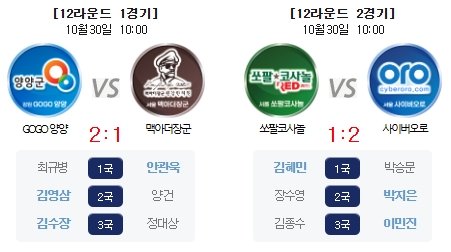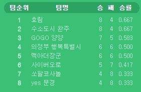 이밖에 4승7패팀끼리 벌인 '단두대 매치'에서는 사이버오로가 쏘팔코사놀을 2-1로 누르고 5승7패로 희망을 이어간 반면 패한 쏘팔코사놀과 예스문경은 4승8패로 이번 시즌이 어려워졌다.