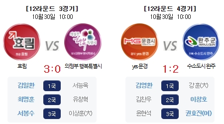 빠르게 종착역을 향해 가는 정규시즌은 다음주 화요일(11월 4일) 통합 경기로 13라운드를 속행한다. 대진은 쏘팔코사놀-GOGO양양, 효림-사이버오로, 예스문경-맥아더장군, 의정부행복특별시-수소도시완주.