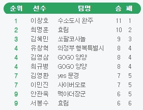 또 이날 선두권팀 경기 못지 않게 관심을 끌었던 GOGO양양과 맥아더장군의 중위권 한판 승부에서는 GOGO양양이 맥아더장군을 2-1로 누르고 팀 4연승과 함께 7승5패로 단독 3위에 올라섰다. 맥아더 장군은 5연승 후 연패를 당하며 5위.