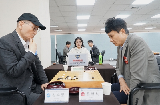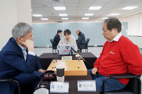 ▲ 추억이 묻어 나는 왕년 '도전 5강' 간 대결. 최근 호조의 강훈 9단(왼쪽)이 장수영 9단을 꺾고 수소도시완주의 승리를 결정했다.