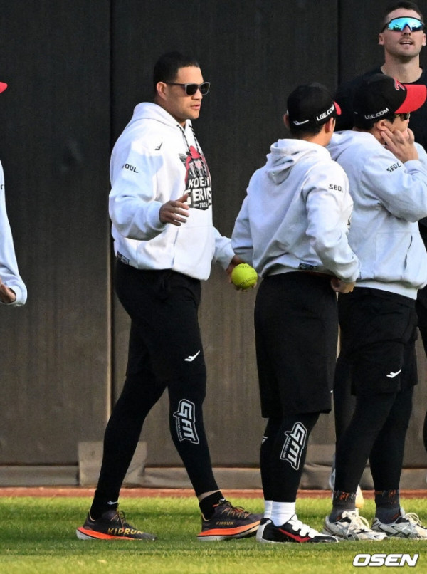 [OSEN=대전, 지형준 기자] 29일 대전 한화생명볼파크에서 2025 신한 SOL Bank KBO리그 포스트시즌 한국시리즈 3차전 한화 이글스와 LG 트윈스의 경기가 열렸다.이날 경기에 한화는 폰세를, LG는 손주영을 선발투수로 내세웠다. 경기에 앞서 LG 치리노스가 동료들과 인사를 나누고 있다. 2025.10.29 /[email protected]