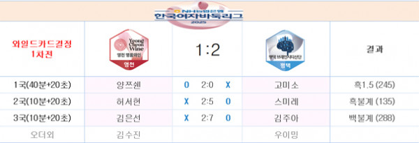 정규리그 4위 영천명품와인은 0-1에서 대만 용병 양쯔쉔 6단이 대역전극으로 불씨를 살렸으나 김은선 6단이 이어받지 못했다. 평택의 특급 용병 우이밍 7단이 나오지 못한 1차전에서 끝내지 못한 점도 아쉬움으로 남았다.