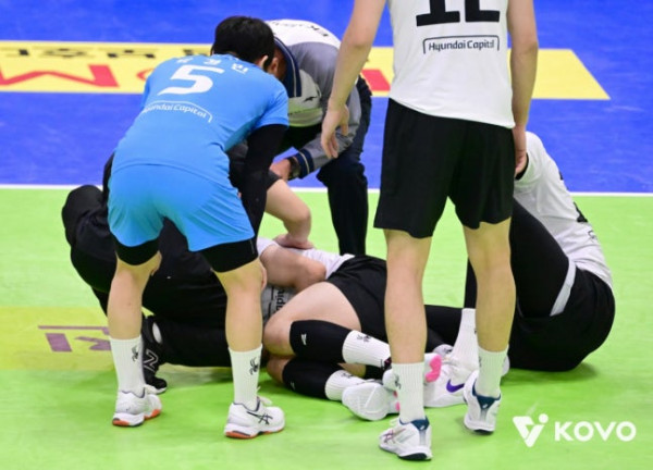 황승빈이 29일 수원실내체육관에서 열린 현대캐피탈 대 현국전력의 '진에어 2025~2026 V리그 남자부' 1라운드 도중 어깨 부상을 당해 들것에 실려가고 있다. /사진=KOVO 제공