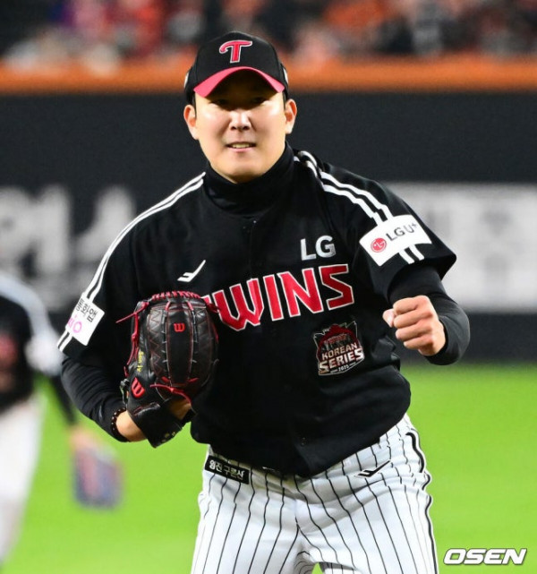 [OSEN=대전, 지형준 기자] 29일 대전시 중구 부사동 대전한화생명볼파크에서 2025 신한 SOL Bank KBO리그 포스트시즌 한국시리즈 3차전 한화 이글스와 LG 트윈스의 경기가 진행됐다.이날 경기에 한화는 폰세를, LG는 손주영을 선발투수로 내세웠다. 4회말 2사에서 LG 손주영이 한화 이진영을 삼진 처리하며 주먹을 움켜쥐고 있다. 2025.10.29 /[email protected]