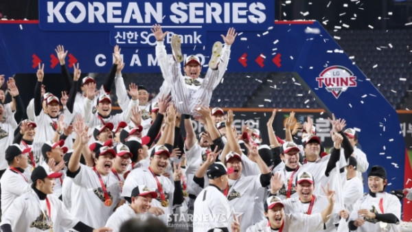 LG 선수단이 2025 한국시리즈 우승 후 트로피를 들어보이고 있다. /사진=스타뉴스