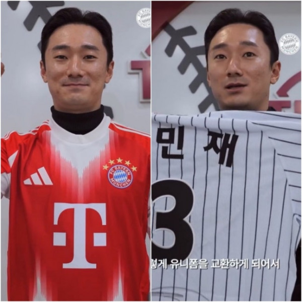 최근 뮌헨 관계자가 서울 잠실구장을 찾아 신민재에게 선물을 전달했다. 상자 안에는 김민재의 등번호인 3과 영문명 'MINJAE'가 적힌 뮌헨 유니폼이 있었다. 이에 신민재는 LG 유니폼에 '김민재'와 '3'을 새겨넣어 답례했다. 신민재는 "같은 민재로서 앞으로도 선전을 기원하겠습니다. 민재 파이팅!"이라고 외쳤다. 유니폼 교환 이벤트는 뮌헨 구단이 먼저 제안했다. 해당 영상은 신민재가 KBO 골든글러브 수상(2루수 부문)한 이틀 뒤인 지난 11일 촬영됐다.