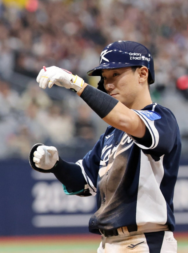 (서울=연합뉴스) 이동해 기자 = 9일 오후 서울 구로구 고척스카이돔에서 열린 '2025 네이버 K-BASEBALL 시리즈' 대한민국과 체코의 평가전. 4회초 2사 1,3루 신민재가 1타점 적시타를 때려낸 뒤 세리머니를 하고 있다. 2025.11.9 [email protected]/2025-11-09 14:59:35/ <저작권자 ⓒ 1980-2025 ㈜연합뉴스. 무단 전재 재배포 금지, AI 학습 및 활용 금지>