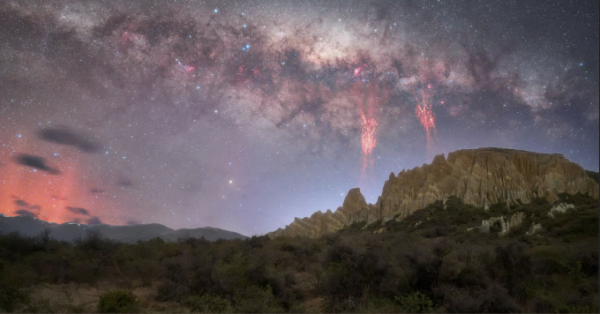 '붉은 번개' 사진은 지난 10월 뉴질랜드 상공에서 포착된 희귀한 '붉은 스프라이트'를 담았다. 스프라이트는 지표면이 아닌 높은 상공에서 발생하는 번개다. 일반 번개와 달리 위쪽으로 치솟으며 붉은빛을 띠고 몇 밀리초 만에 사라져 육안으로 보기 어렵다. 사진작가 톰 레이는 "마치 실제가 아닌 것을 보는 것 같다. 매우 몽환적이다"라고 말했다.