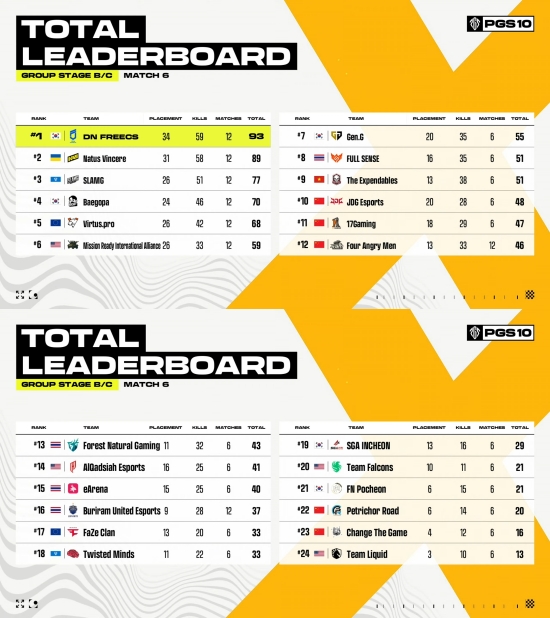지난 1일 차 포함 12매치를 모두 소화한 DN 프릭스와 배고파는 2일 차에도 호성적을 거둬 파이널 진출을 사실상 확정 지었다. 더불어 오늘 첫 경기에 나선 젠지도 55점이라는 고득점에 성공해 파이널 진출 확률이 매우 높아졌다.