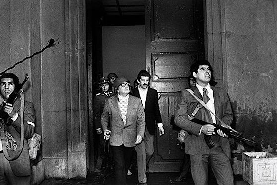 민주적으로 선출된 살바도르 아옌데 대통령은 1973년 9월 11일 칠레 산티아고의 대통령 궁에서 군사 쿠데타가 일어날 때 사망했습니다.