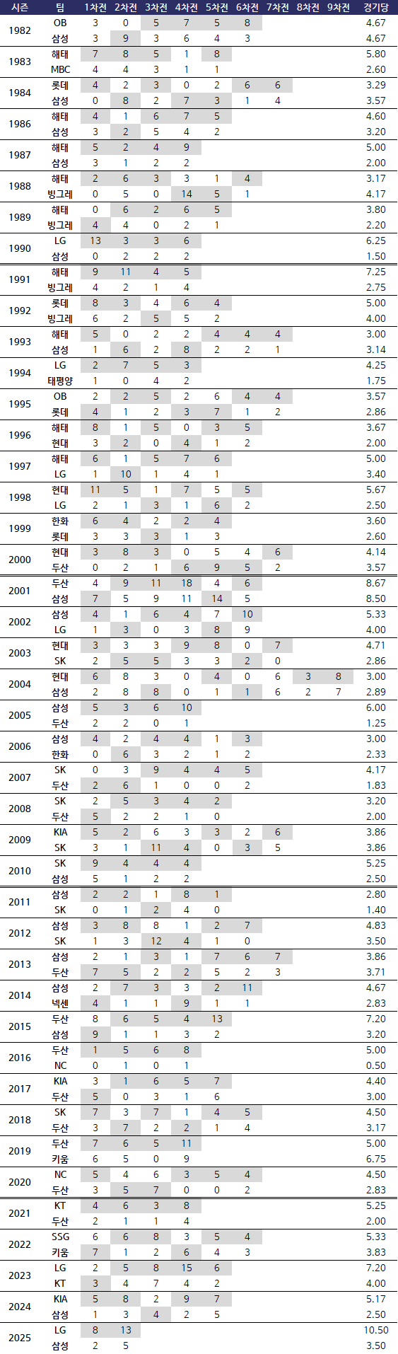 역대 한국시리즈 경기별 스코어 및 평균 득점. ⓒ 데일리안 스포츠