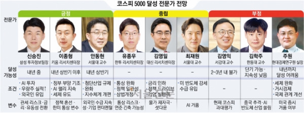서울신문이 28일 의뢰한 전문가 9명 가운데 6명은 내년 상반기 코스피 5000선 돌파가 ‘가능하다’고 봤다. 나머지 3명은 코스피가 과대평가 돼있다며 어려울 것으로 전망했다.