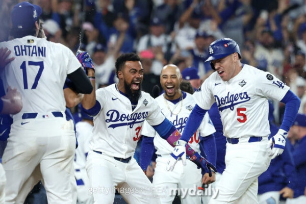 끝내기 순간 환호하는 다저스 선수단./게티이미지코리아