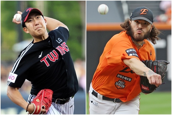 29일 대전 한화생명 볼파크에서 열리는 2025 프로야구 한국시리즈 3차전에 선발로 예고된 LG 트윈스 손주영(왼쪽)과 한화 이글스 코디 폰세 [연합] |