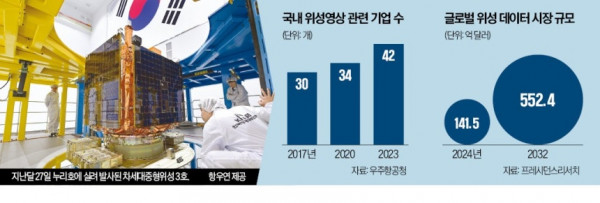 다만 기술 개발 못지않게 위성영상의 수집과 유통, 판매를 뒷받침할 법제 정비가 과제로 지적된다. 현행 우주 관련 법령은 민간 우주 데이터 활용에 관한 내용이 공백에 가깝다고 업계는 지적한다. 우주개발진흥법은 위성정보 보급·활용 대상을 ‘기본계획에 따라 개발된 인공위성’으로 한정하고 있다. 민간이 개발한 위성은 제도권 밖에 놓인 셈이다. 재난·재해 관측 등 공공 목적에 따라 발사된 위성은 해외 판매 등을 추진하고 싶어도 국내 정보당국의 ‘보안 규정’을 이유로 해상도를 낮춰야 한다. 반면 미국은