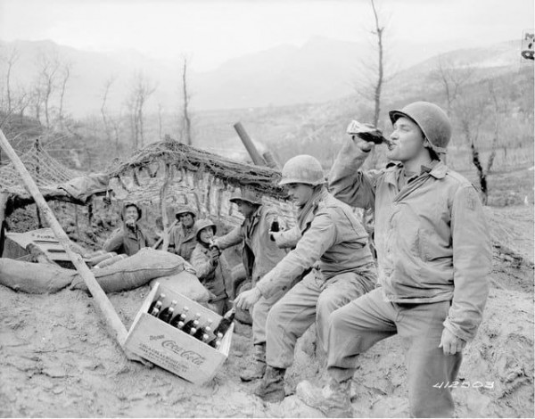 1944년 3월 17일, 이탈리아에서 미국의 133번째 포병 대대 병사들이 코카-콜라를 마시고 있습니다.2차 세계대전 기간 동안 미국 군대에는 약 50억 병의 코카콜라가 공급되었습니다.