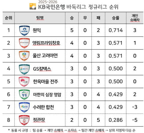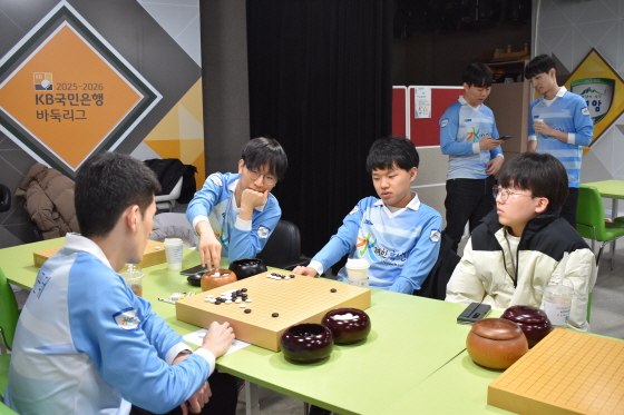 ○● 2025-2026 KB국민은행 바둑리그는 내년 2월까지 8개 팀이 더블리그 방식으로 총 14라운드 56경기를 치른다. 정규리그 상위 4개 팀이 포스트시즌에 진출해 우승 상금 2억 5,000만원을 놓고 최종 대결을 펼친다. 매 경기 5판 3선승제로 진행되며, 기본 시간 1분에 착수할 때마다 15초가 추가되는 피셔 룰 방식이 적용된다.
