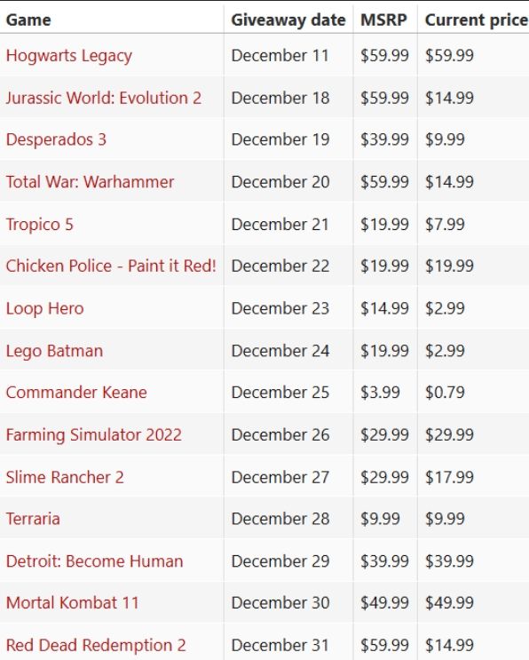 에픽게임즈 스토어가 연말연시를 맞아 첫 PC 게임 무료 증정 이벤트를 시작했습니다. AAA급 타이틀인 호그와트 레거시(현재 아마존에서 32달러)는 팬들이 이번 연말 세일의 시작을 알릴 게임으로 예상했던 것과는 다른 게임입니다. 참고로 이번 주 PC 무료 증정 이벤트는 안드로이드 및 iOS 이벤트와는 다른 내용이며, 자세한 내용은 별도로 안내해 드리겠습니다.