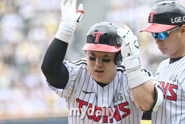 17일 서울 잠실야구장에서 열린 '2025 신한 SOL BANK KBO리그' KT 위즈와 LG 트윈스 더블헤더 1차전 경기. LG 박동원 2회말 첫 타석에 안타를 친 뒤 기뻐하고 있다./마이데일리