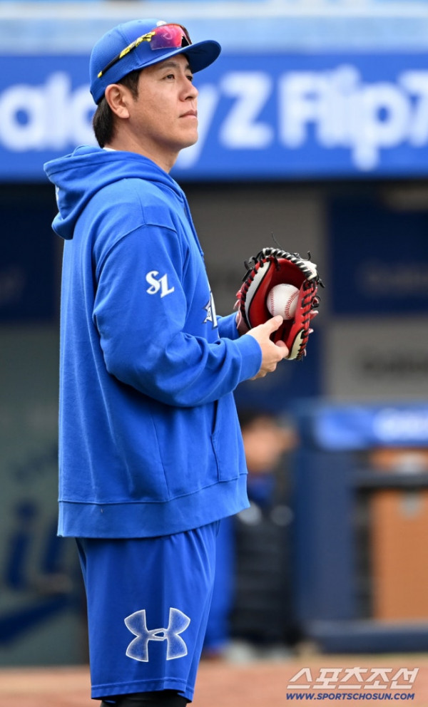 22일 대구 삼성라이온즈파크에서 열린 한화와 삼성의 PO 4차전, 삼성 강민호가 캐치볼을 하고 있다. 대구=허상욱 기자[email protected]/2025.10.22/
