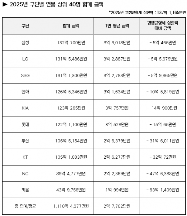 합계 금액을 40명으로 나눈 선수당 평균 금액은 2억 7,762만원이다.