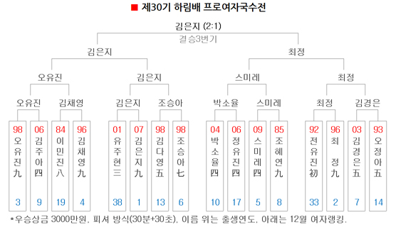 전기보다 10명 늘어난 51명이 참가한 예선을 통과한 12명과 시드를 받은 4명이 16강 본선 토너먼트로 우승 경쟁을 벌인 제30기 하림배 프로여자국수전의 상금은 우승 3000만원, 준우승 1000만원이다.