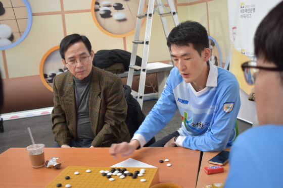 ▲ 합천과 오래 전부터 인연을 맺고 있는 백성호 9단이 선수들을 격려하기 위해 검토실을 찾았다.
