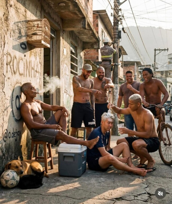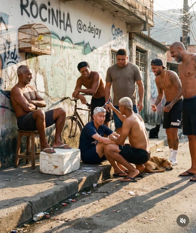 여기에 뜬금없는 인물이 있었다. 주인공은 바로 손흥민. 합성 이미지 속 히샬리송은 손흥민의 머리를 염색해 주는 모습으로 등장했고, 주변에 모인 브라질 레전드들은 이를 흥미롭게 바라보며 웃음을 짓고 있었다.