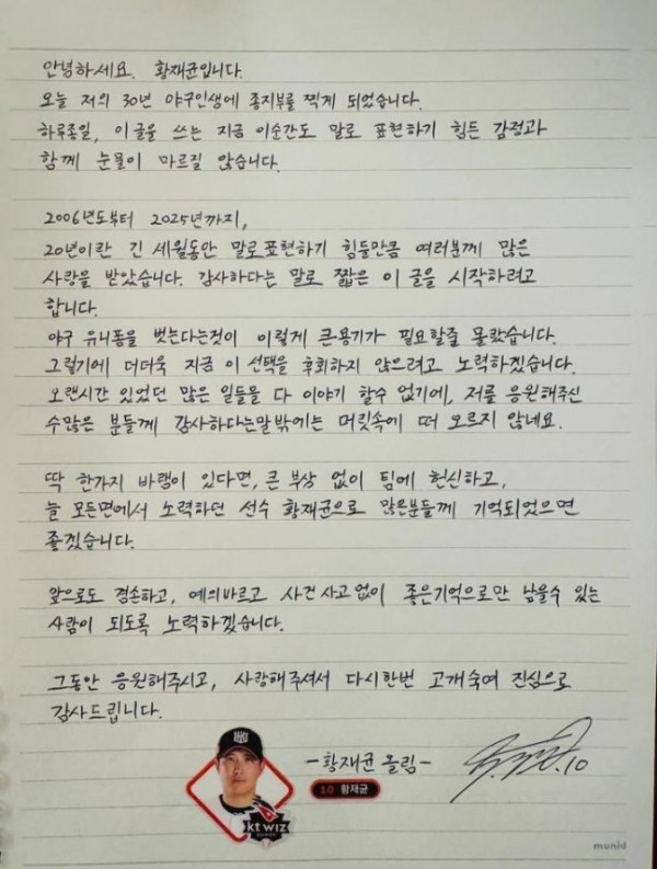황재균이 개인 소셜네트워크서비스(SNS)에 자필 편지를 올려 작별 인사를 전했다. (사진=황재균 SNS). 2025.12.19. *재판매 및 DB 금지