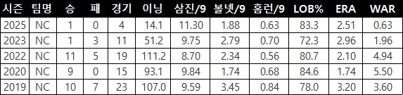 올시즌도 6월 상무 전역 후 3개월 가까이 지난 9월 7일에야 1군 마운드에 설 수 있었다. 정규 시즌 4경기에 등판해 14.1이닝 평균자책점 2.51을 기록했고 와일드카드 결정전에서도 6이닝 1실점으로 호투했지만 총 5번의 투구만으로는 완벽한 회복을 확신하기엔 여전히 조심스럽다는 게 NC측 입장이다.