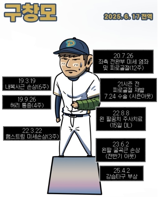 2019시즌 이후 다양한 부상에 시달린 구창모(출처: 2025 KBO 야매카툰 중)