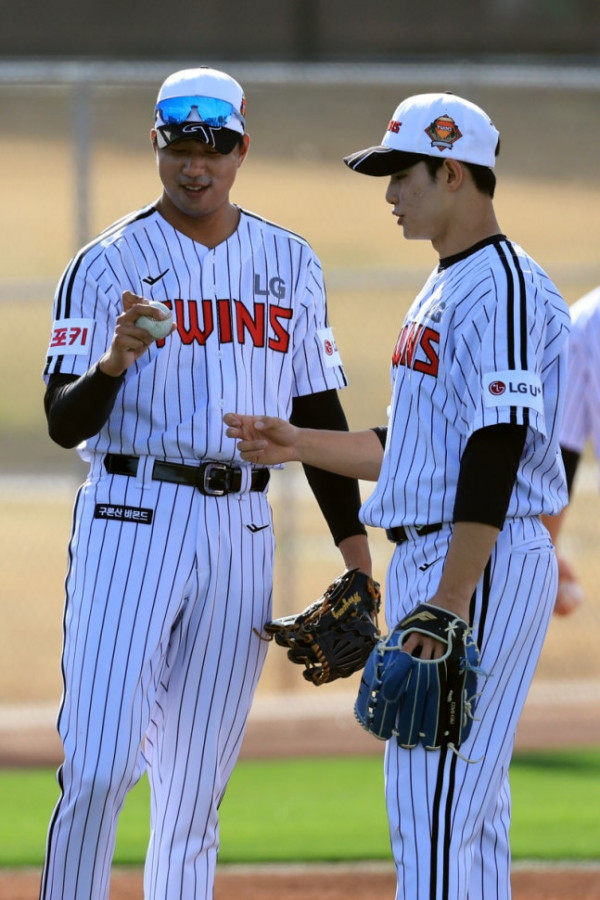2025 미국 애리조나 스프링캠프에서 대화 중인 서울고 출신 선후배 정우영(왼쪽)과 신인 김영우. 사진=연합뉴스