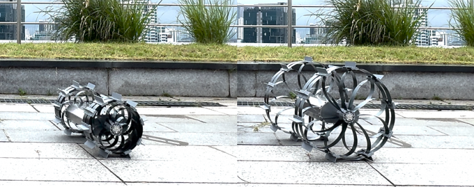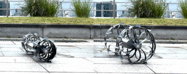 탄성 강철 소재를 접고 나선형으로 엮어 만든 '전개형 에어리스 휠'은 일반 바퀴처럼 경첩 같은 부품이 없다. 접혀 있을 때는 지름 23cm, 펼치면 50cm까지 커진다. 소형 로버도 큰 장애물을 넘을 수 있다는 뜻이다.