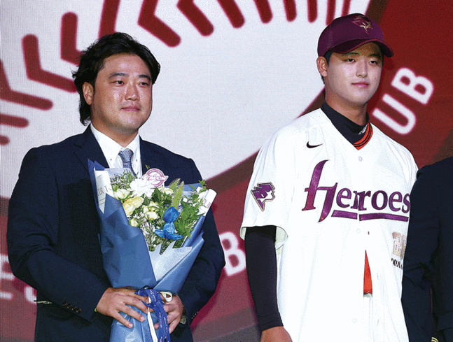 지난 9월 17일 서울 송파구 롯데호텔 월드에서 열린 ‘2026 KBO 신인 드래프트’에서 1라운드 1순위로 키움 히어로즈에 선발된 박준현이 아버지 박석민 코치와 기념 촬영을 하고 있다. photo 뉴스1